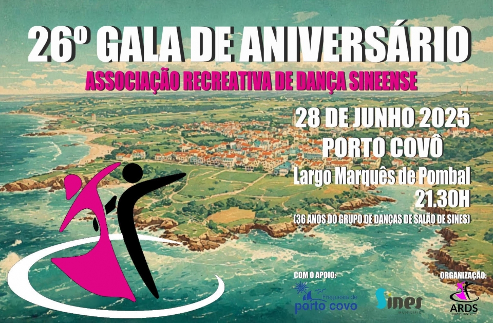 A Associação Recreativa de Dança Siniense realiza neste sábado, dia 28 de junho, a 26.ª Gala de Aniversário, no Largo Marquês de Pombal em Porto Covo, a partir das 21h30.