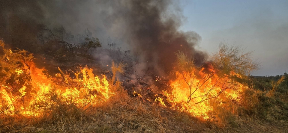 O incêndio está a consumir uma área de mato perto de São Cristóvão, no concelho de Montemor-o-Novo.