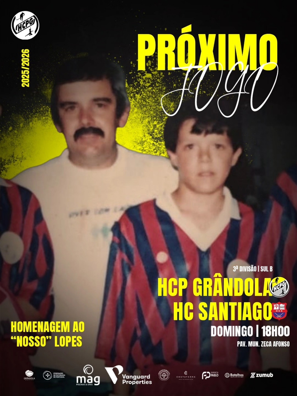 O Hóquei Clube Patinagem de Grândola recebe neste domingo às 18h00, o HC Santiago, na 11.ª jornada do Campeonato Nacional da 3.ª divisão – Zona Sul B. Durante a partida será homenageado Manuel Lopes Morais por tudo aquilo que deu ao hóquei em Grândola.