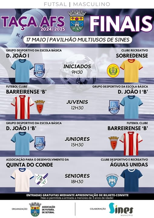 O Pavilhão Multiusos de Sines recebe neste sábado, dia 17 de maio, ao longo do dia, as finais da Taça AFS (futsal). Finais nos escalões Iniciados (9h30), Juvenis (12h30), Juniores (15h30) e Seniores (18h30).