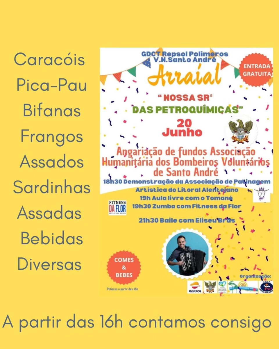 O polidesportivo do GDCT da Repsol em Vila Nova de Santo André, recebe nesta sexta-feira, a partir das 16 horas, um “Arraial” popular com comida e animação com o objetivo de ajudar os Bombeiros de Santo André. Seja solidário ajude os bombeiros.